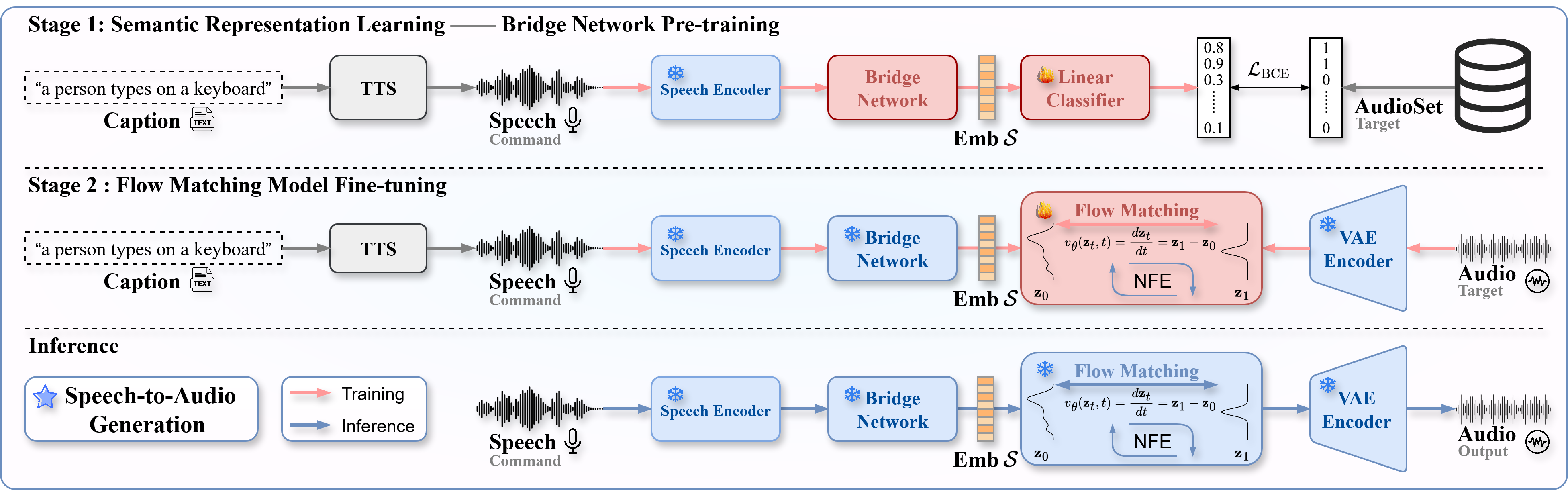 This work presents STAR, the first end-to-end speech-to-audio generation framework, designed to enhance efficiency and address error propagation inherent in cascaded systems. Unlike prior approaches relying on text or vision, STAR leverages speech as it constitutes a natural modality for interaction. As an initial step to validate the feasibility of the system, we demonstrate through representation learning experiments that spoken sound event semantics can be effectively extracted from raw speech, capturing both auditory events and scene cues. Leveraging the semantic representations, STAR incorporates a bridge network for representation mapping and a two-stage training strategy to achieve end-to-end synthesis. With a 76.9% reduction in speech processing latency, STAR demonstrates superior generation performance over the cascaded systems. Overall, STAR establishes speech as a direct interaction signal for audio generation, thereby bridging representation learning and multimodal synthesis. Generated samples are available below. Demo Navigation.